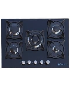 Plaque De Cuisson Encastrable FRANCO – Type de Plaque: à Gaz – Largeur: 70 cm – Nombre de Foyers: 5 foyers – Grilles fonte – Commandes par boutons – Revêtement: Vitro noir – Brûleur centre – Design moderne – Couleur: Noi…